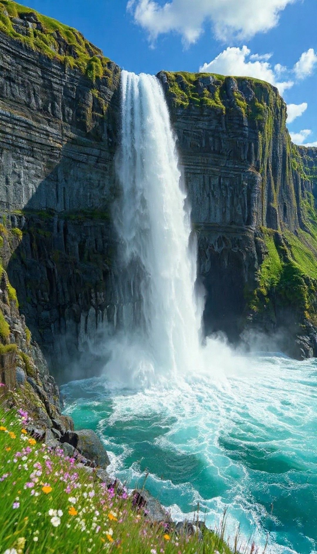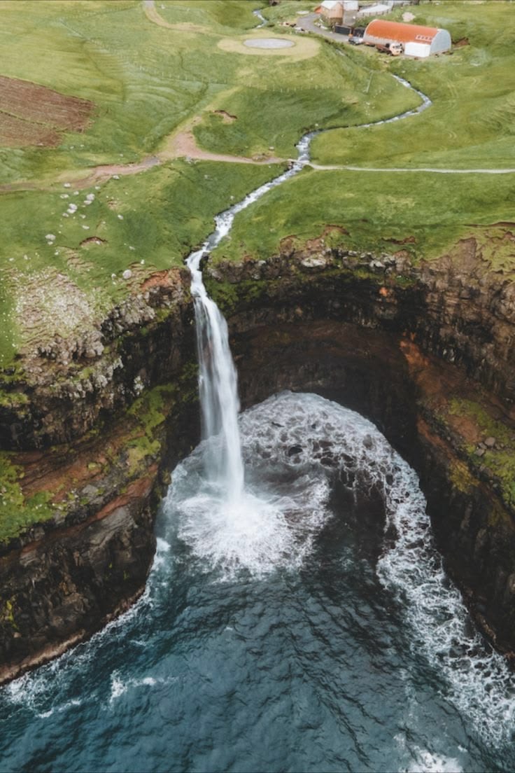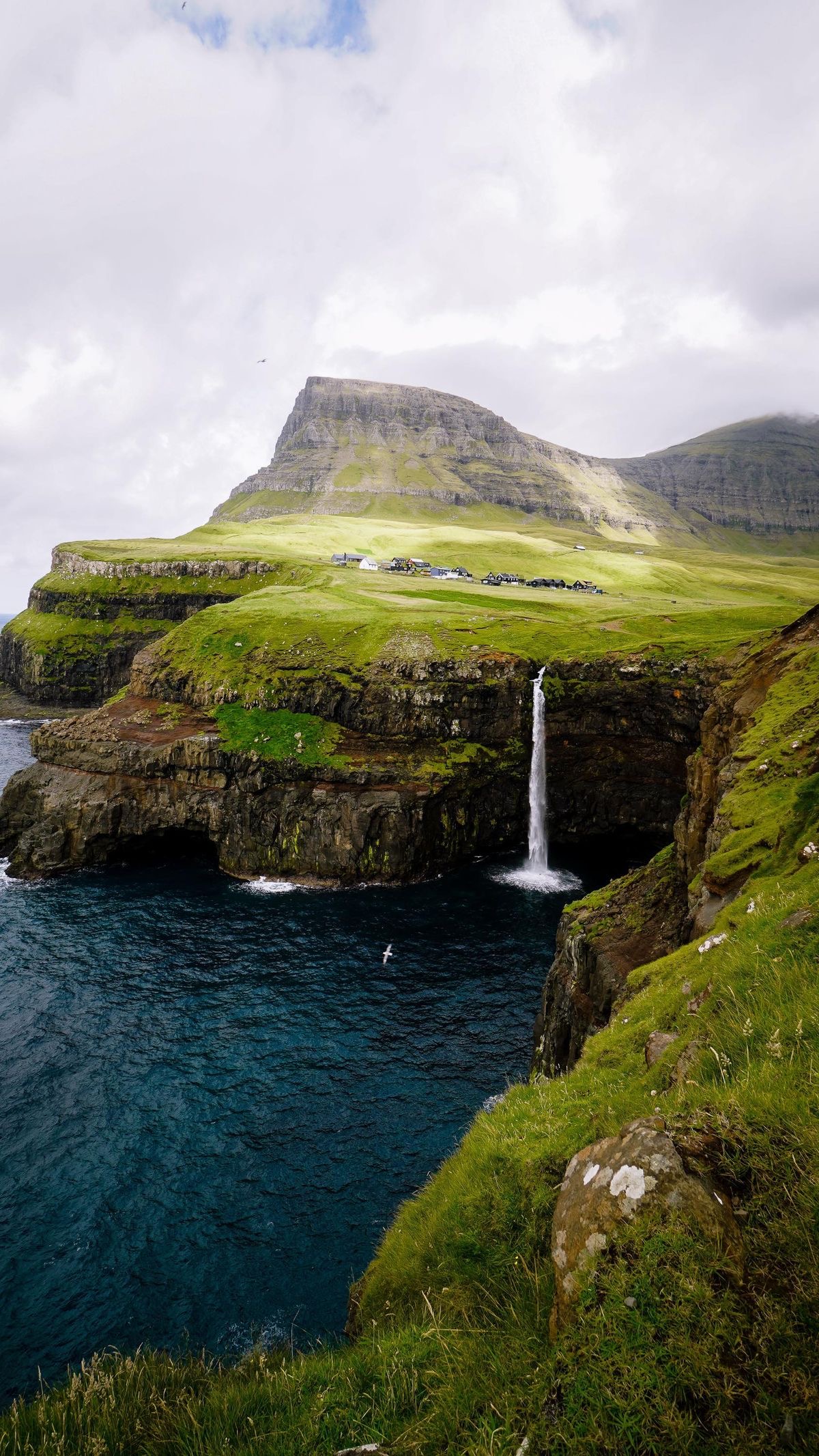 Ти побачиш легендарний Múlafossur Waterfall — водоспад, який ніби зникає прямо в Атлантичному океані. Це один з тих моментів, коли просто стоїш і не віриш, що це реально.